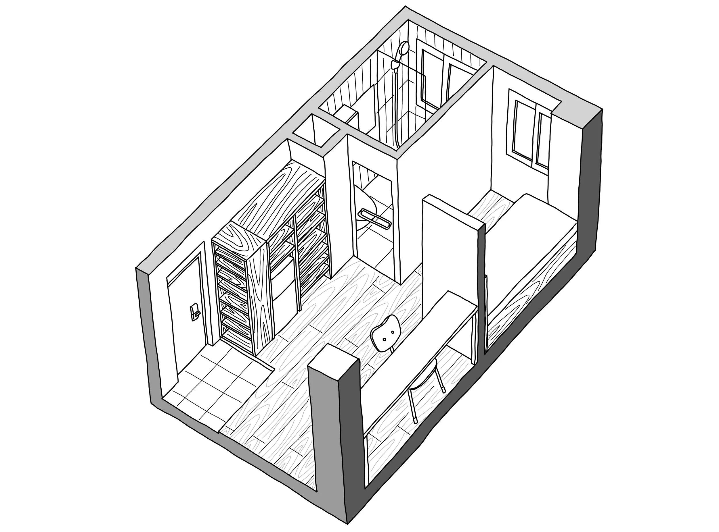 침대 / 책상 / 의자 / 옷장 / 수납장 / 2도어냉장고 / 에어컨 / 인터넷 / 스마트도어락
