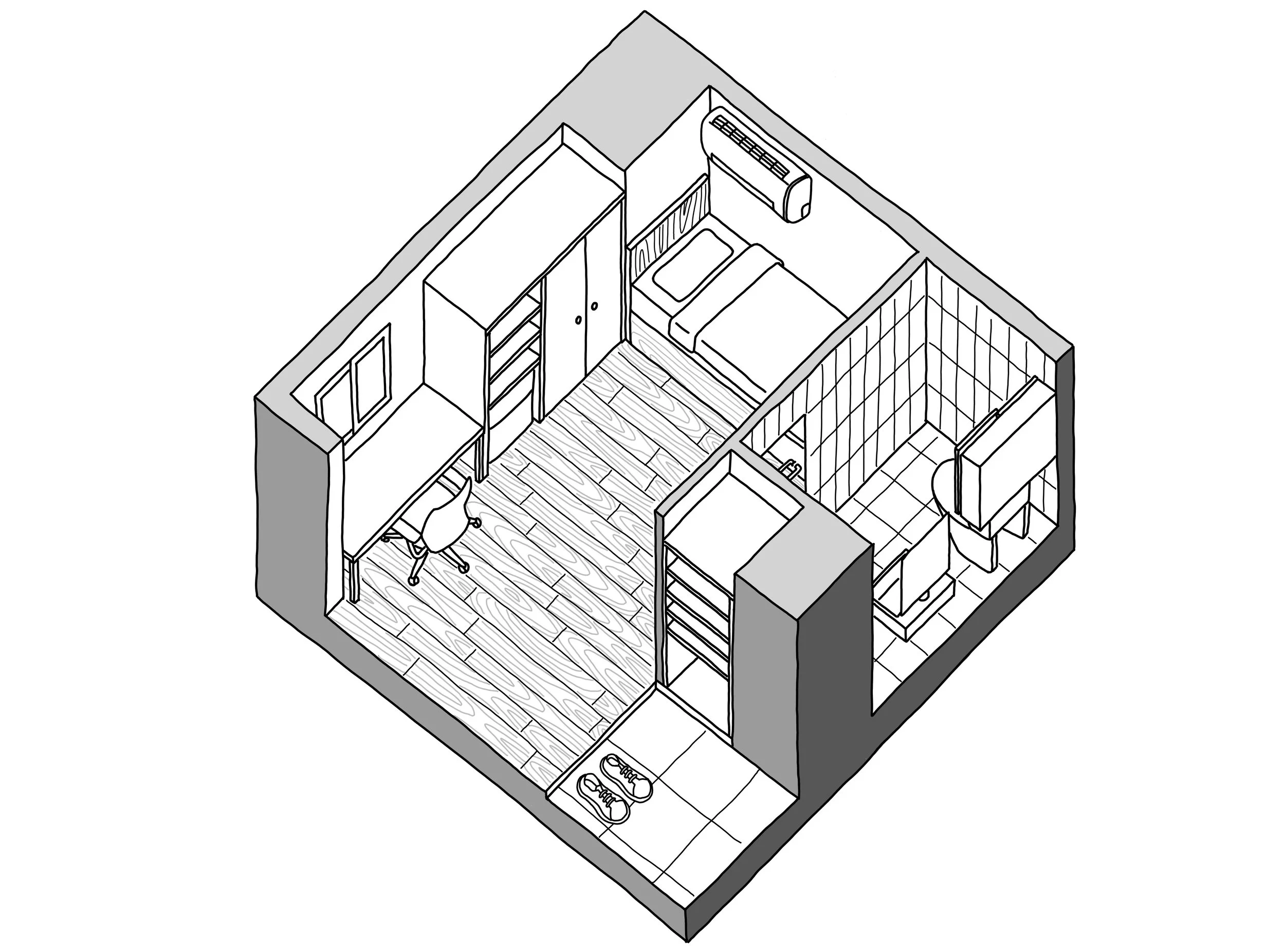 침대 / 책상 / 의자 / 옷장 / 수납장 / 2도어냉장고 / 에어컨 / 인터넷 / 스마트도어락